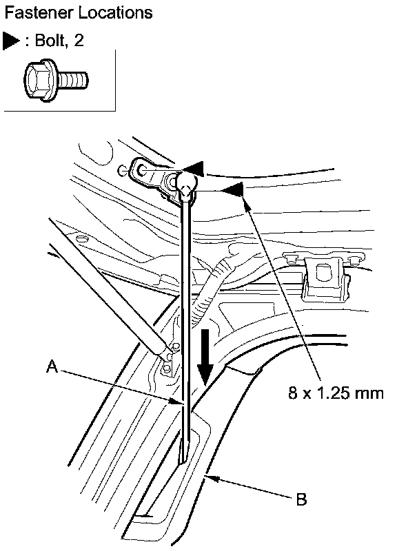 2. Remove the pivot bracket mounting bolts, then push the power tailgate rod (A) in the quarter pillar trim (B).