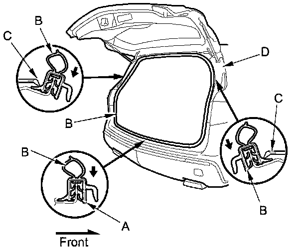 4. Locate the painted alignment mark (A) on the tailgate weatherstrip (B). Align the painted mark with the alignment notch in the center of the tailgate opening, and install the tailgate weatherstrip all the way around. Slip the weatherstrip in under the lips (C) of both rear gutter covers (D). Make sure there are no wrinkles in the weatherstrip.