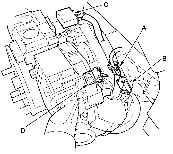 4. Disconnect the dashboard wire harness 4P connector (A) from the cable reel 4P connector and remove the clip (B), then disconnect the dashboard wire harness 20P connector (C) and the wiper/washer switch 8P connector (D).