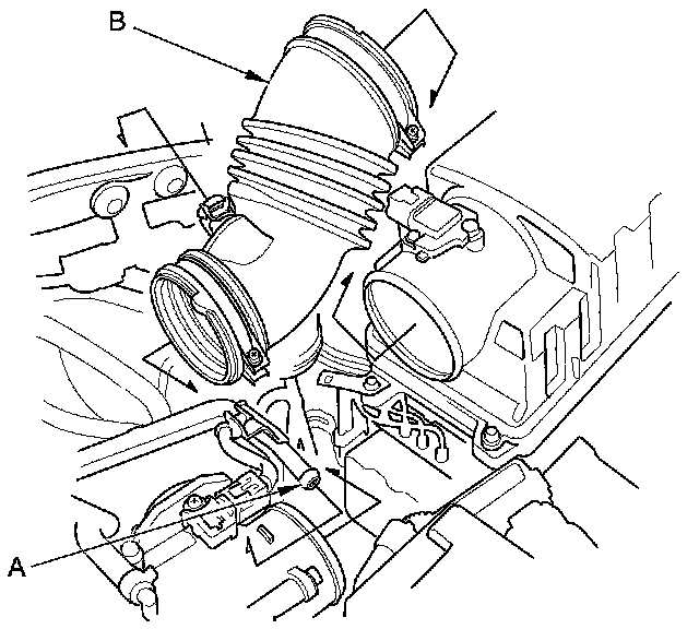 7. Disconnect the breather pipe (A), then remove the intake air duct (B).