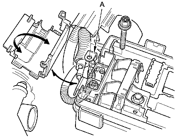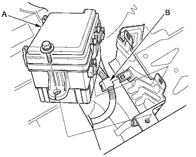 10. Remove the main under-hood fuse box (A), then remove the harness clamp (B).