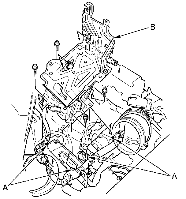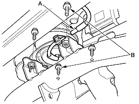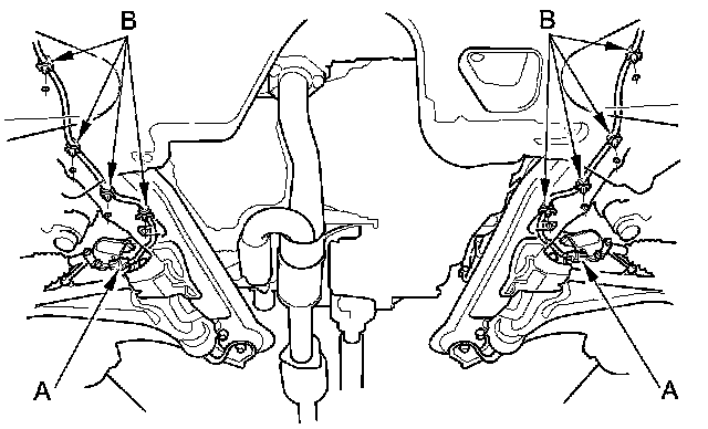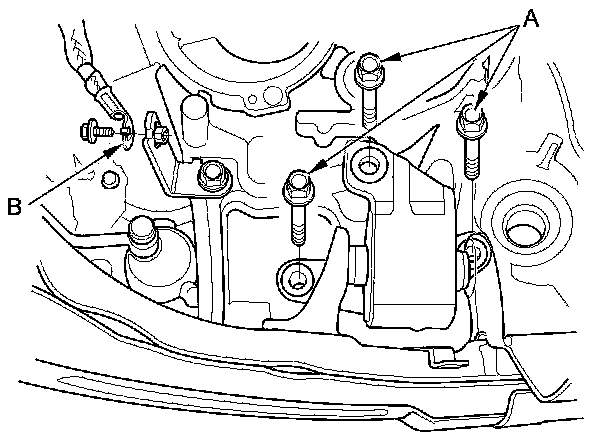 54. Disconnect the front engine mount control solenoid valve tube (A), then remove the front engine mount bolts (B).