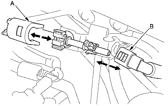 13. Remove the quick-connect fitting cover (A), then disconnect the fuel feed hose (B) Fuel Line/Quick-Connect Fitting Removal.