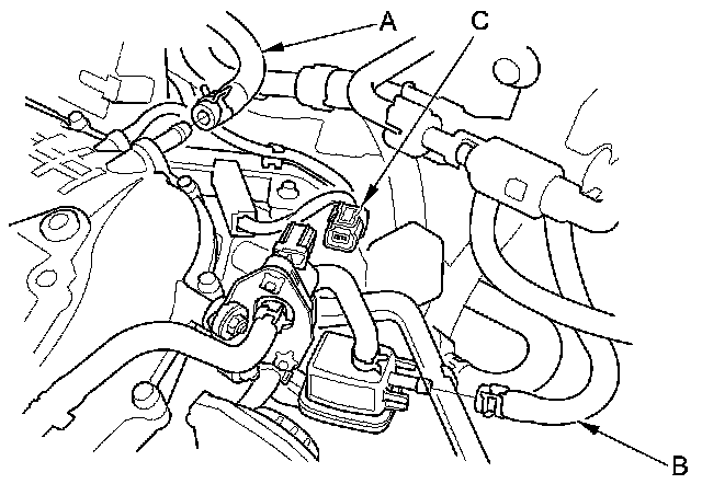 15. Disconnect the EVAP canister purge valve connector (C).