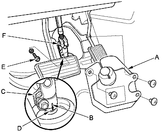 18. Make a reference mark (B) across the steering joint (C) and steering gearbox pinion shaft (D). Remove the steering joint bolt (E), and loosen the steering joint bolt (F), then disconnect the steering joint from the steering gearbox pinion shaft.