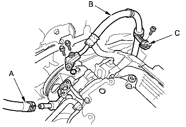 24. Remove the power steering hose bracket (C) from the rear cylinder head cover.