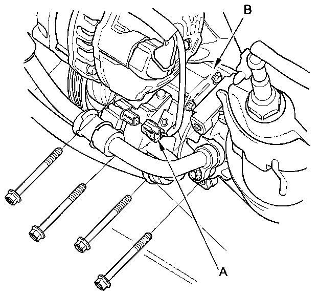 43. Disconnect the A/C compressor clutch connector (A), then remove the A/C compressor (B) without disconnecting the A/C hoses. Do not bend the A/C hoses excessively.
