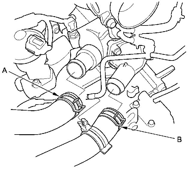 45. Disconnect the upper radiator hose (A) and the lower radiator hose (B).