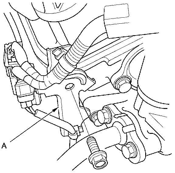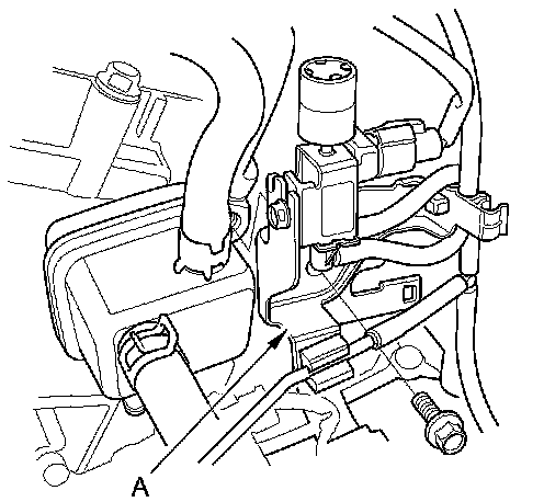 49. Remove the engine mount control solenoid valve bracket (A) from the rear cylinder head; use the bracket bolt hole to attach the engine hanger balance bar rear arm.