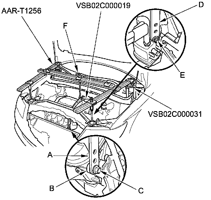 52. Install the engine support hanger (AAR-T1256) onto the vehicle as shown, and attach the hook to the slotted hole in the engine hanger balance bar. Tighten the wing nut (F) by hand, and lift and support the engine/transmission.