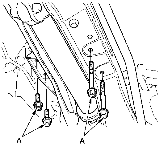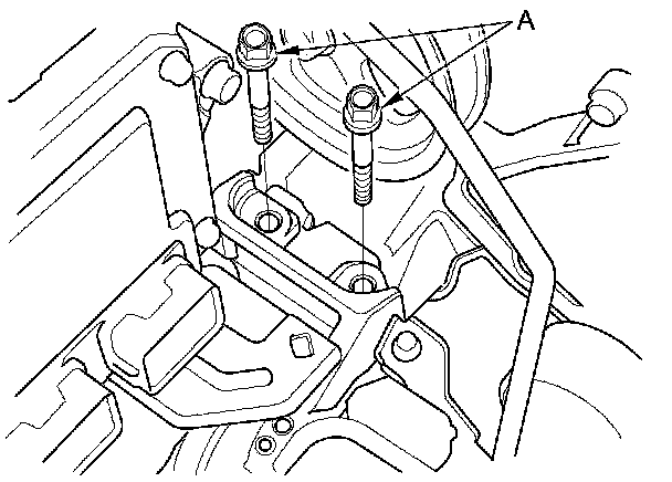 64. Remove the side engine mount bracket mounting bolts (A) for the upper half of the side engine mount bracket.