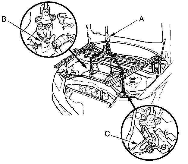 63. Attach a chain hoist (A) to the engine hanger (B) and the transmission hanger (C), then lift the engine/transmission until it is securely supported by the chain hoist, and remove the engine support hanger, the engine hanger balance bar, and the hanger adapter set.
