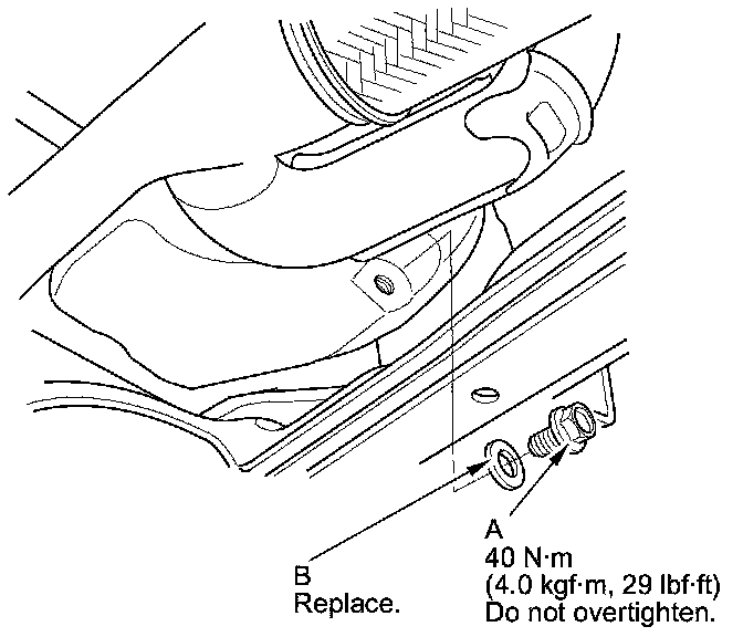 3. Reinstall the drain bolt with a new washer (B) and torque to specification.