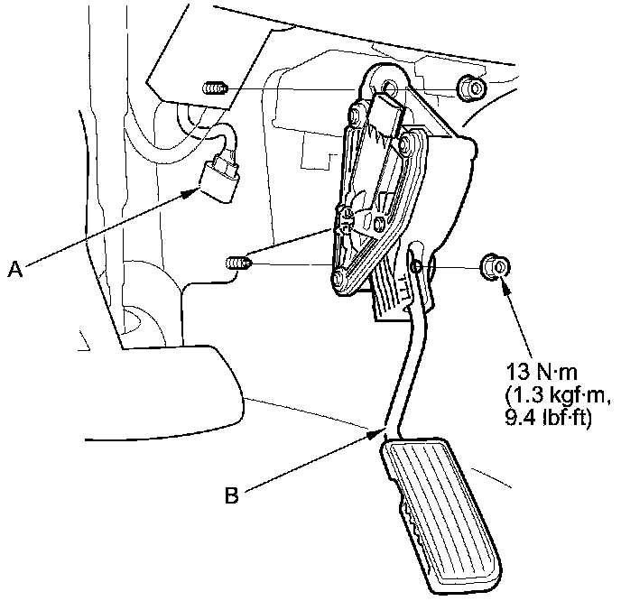 2. Remove the accelerator pedal module (B).