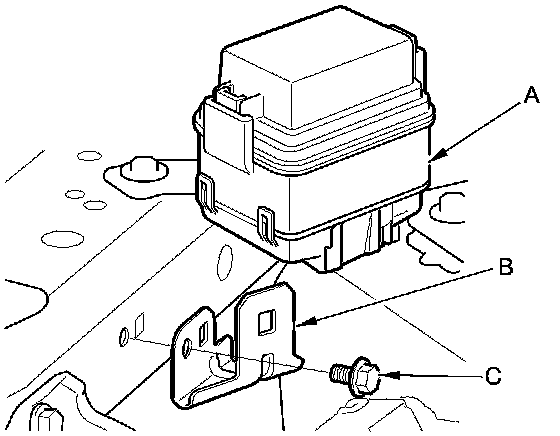 8. Remove the auxiliary under-hood fuse/relay box (A) from the stay (B), then remove the bolt (C).