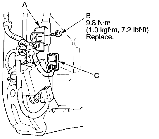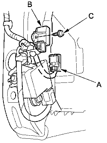 1. Install the front impact sensor (A) with a new TORX bolt (B), then connect the engine compartment wire harness 2P connector (C) to the front impact sensor.