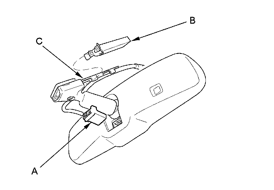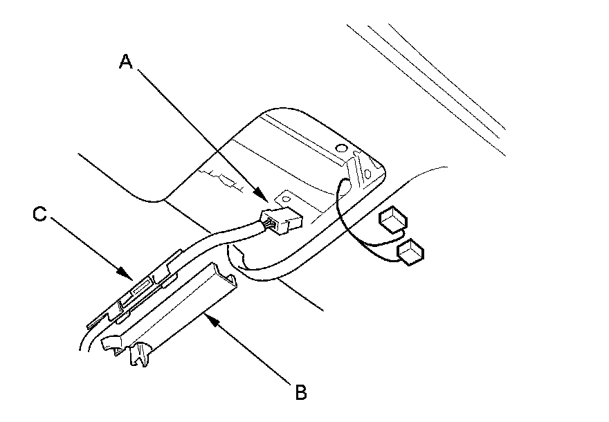 2. Remove the mirror harness cover (B) from the rearview mirror harness cover base (C).