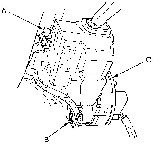 3. Disconnect the combination light switch 12P connector (A) and the steering angle sensor 5P connector (B) from the combination switch assembly/cable reel (C).