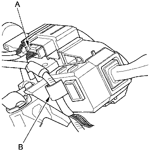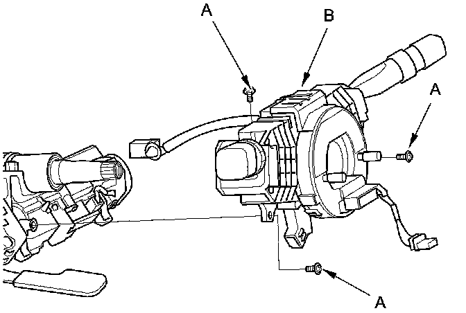 7. Remove the combination switch assembly/cable reel mounting screws (A), then remove the combination switch assembly/cable reel (B) from the steering column.