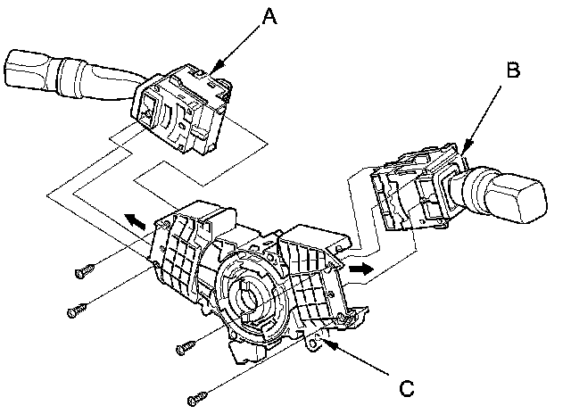 9. Remove the combination light switch (A) and the wiper/washer switch (B) from the combination switch body assembly (C).