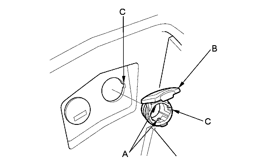 7. Gently depress the tabs (A), then remove the housing (B) form the panel. Note the location of the indexing tabs (C).
