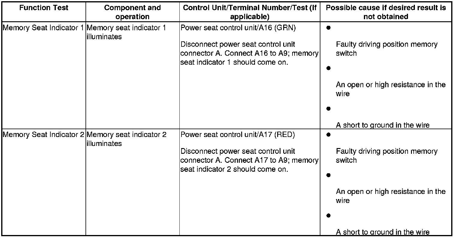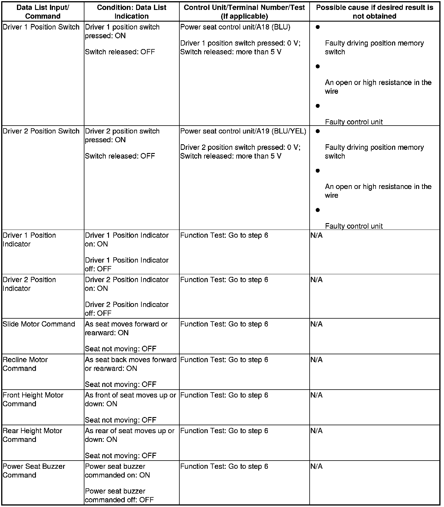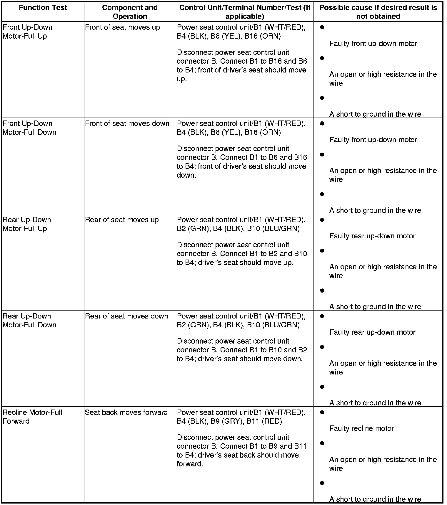 - If the function does not operate normally, perform the appropriate test at the control unit and terminal indicated in the table.