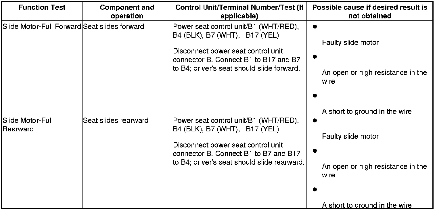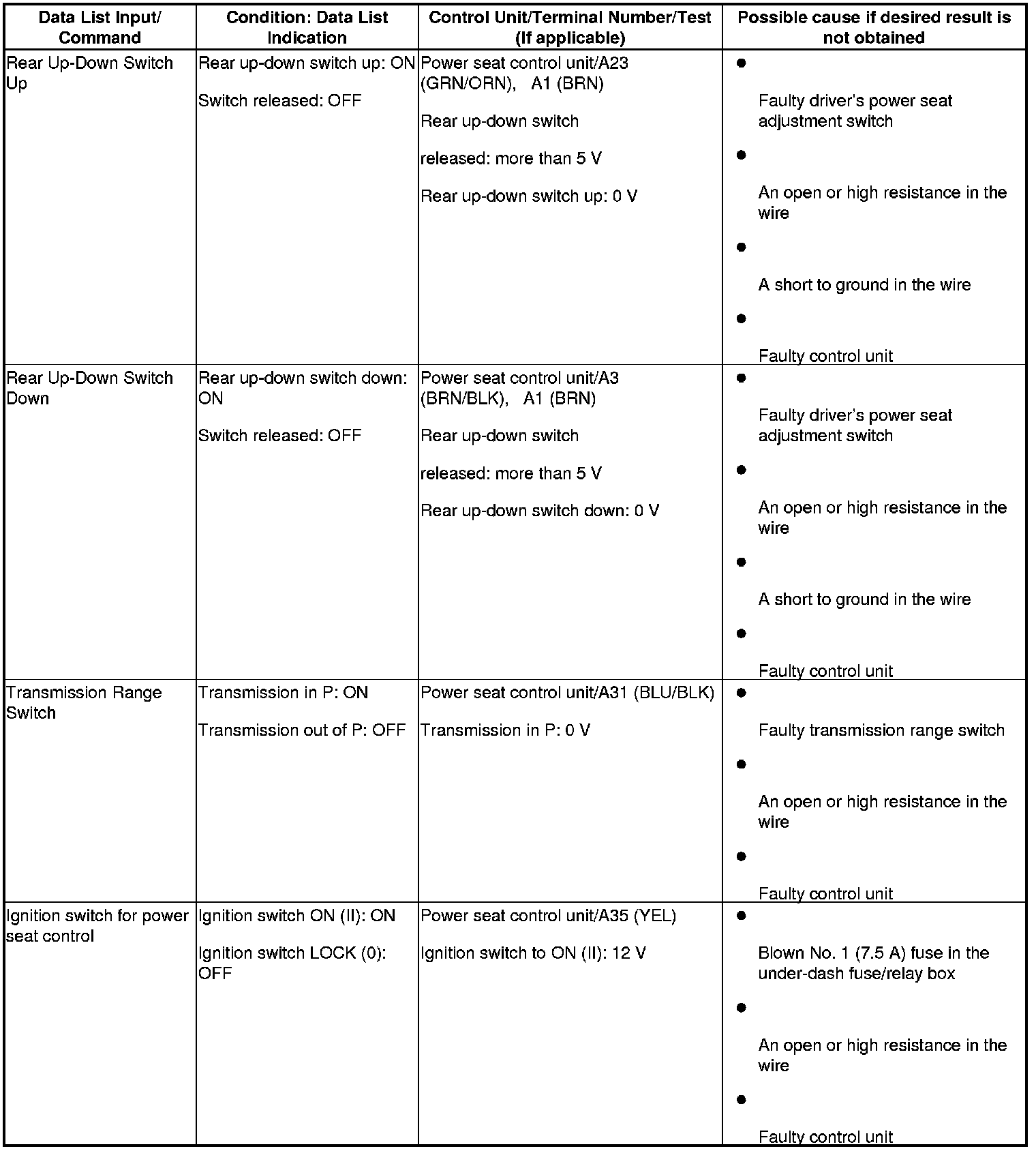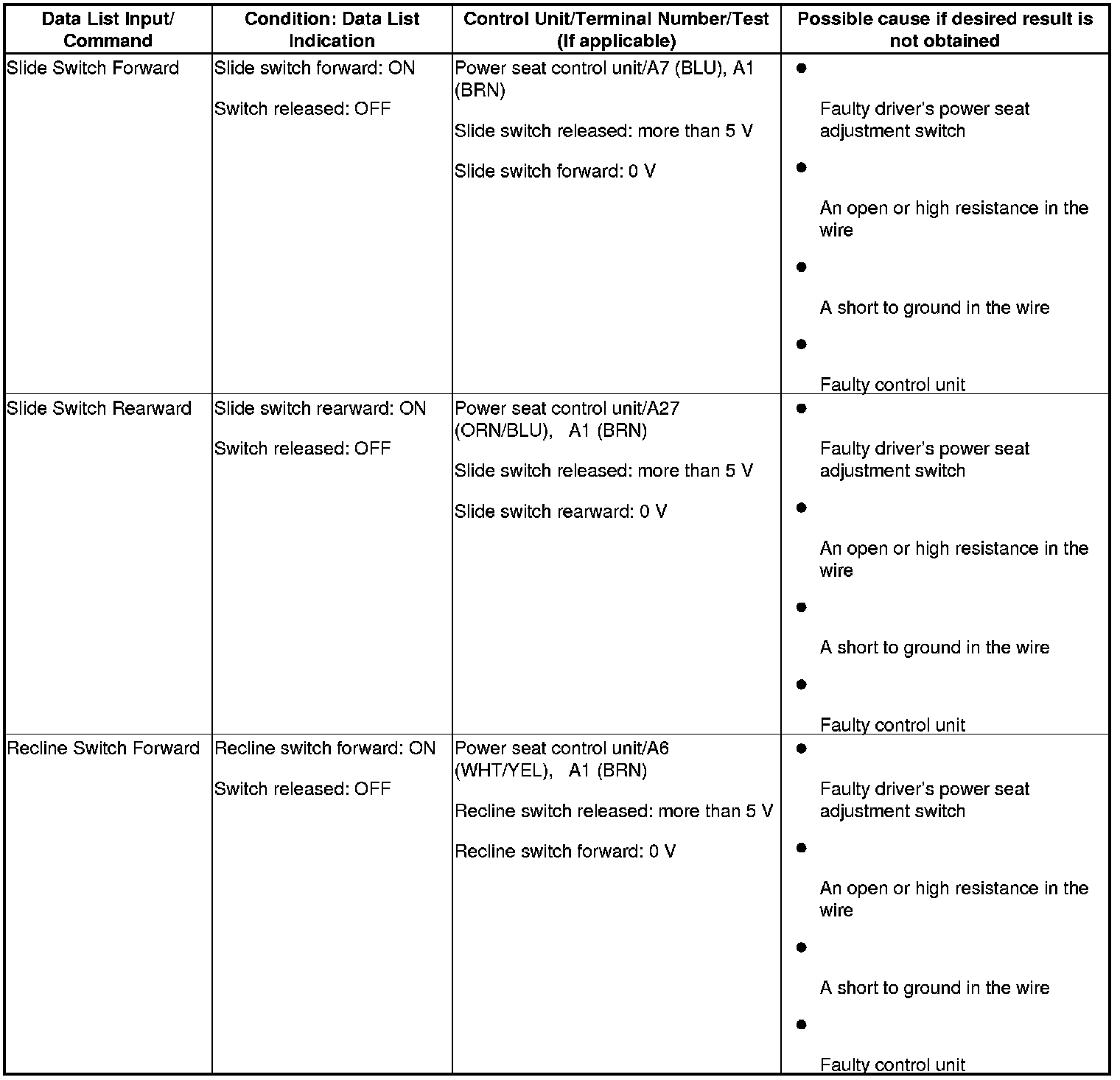 - If the function does not operate normally, perform the appropriate test at the control unit and terminal indicated in the table.