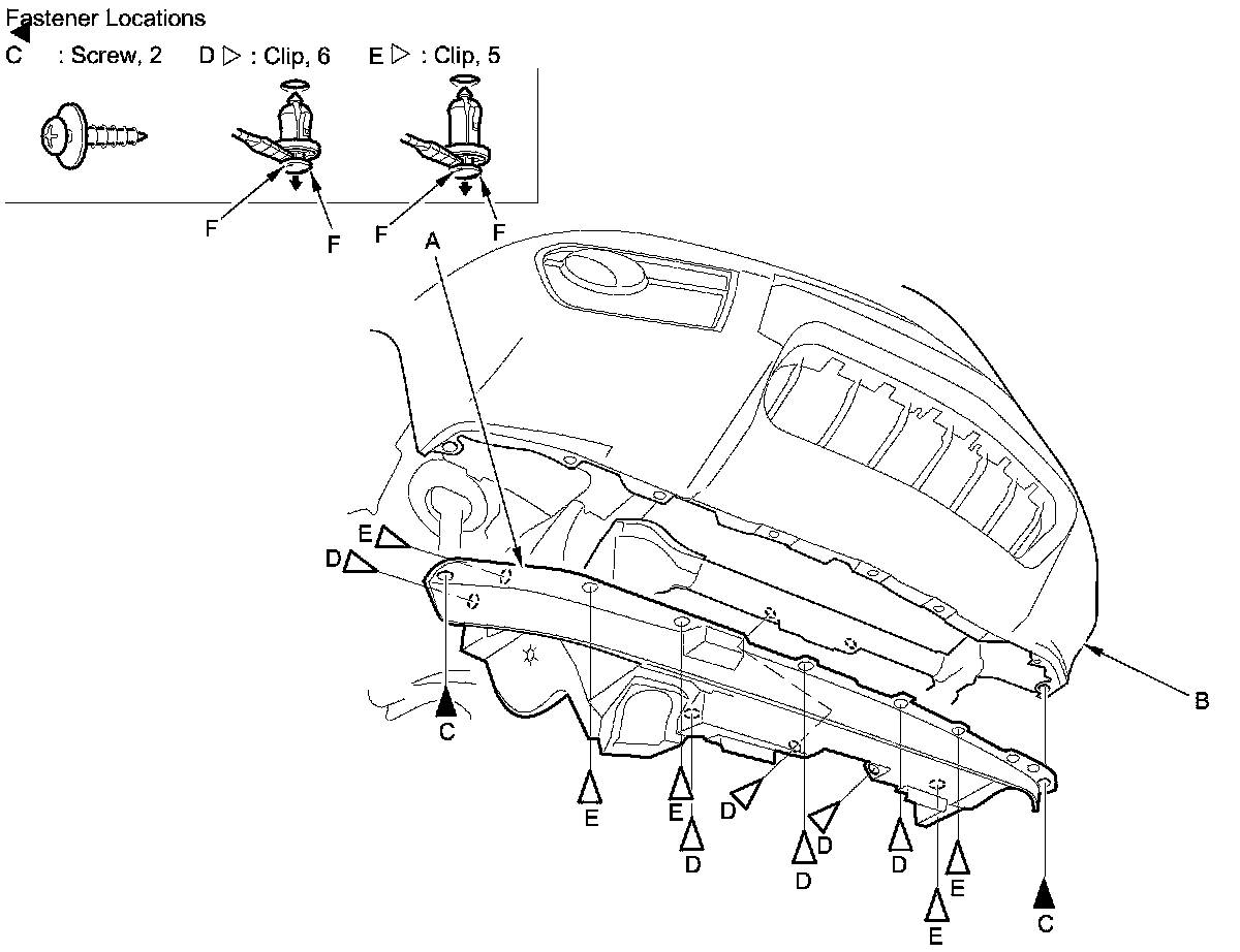 2. From under the body, remove the clips (D, E).