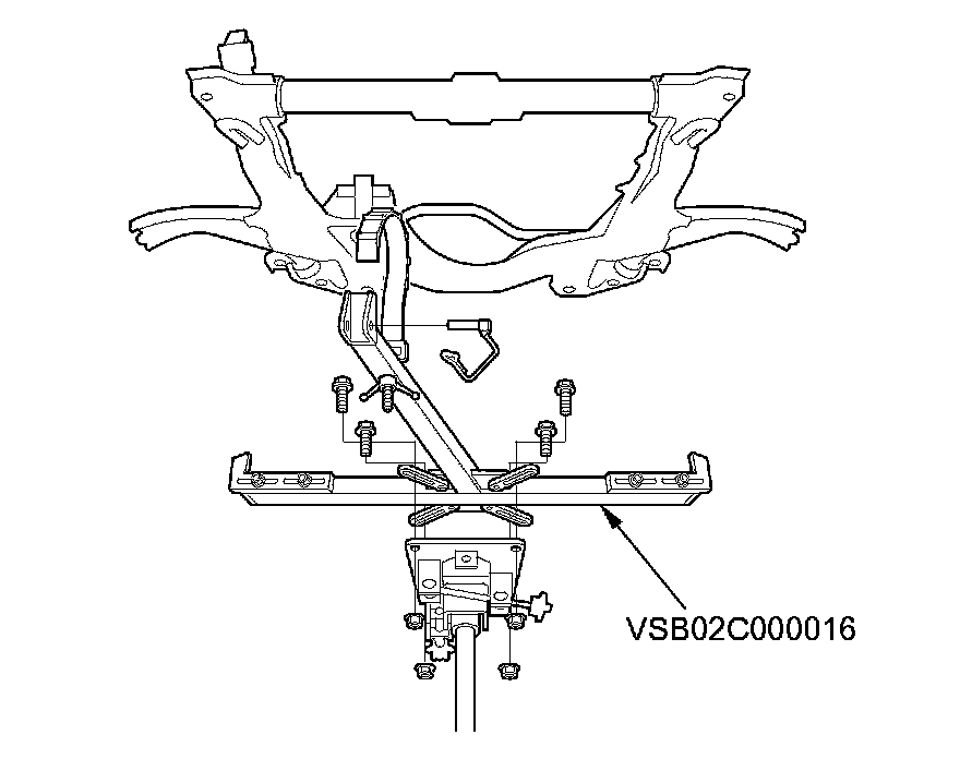 14. Using the subframe adapter (VSB02C000016) and a jack, raise the front subframe up to the body.