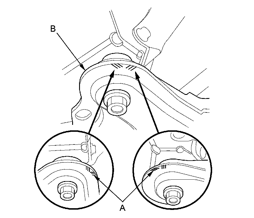16. Align all reference marks (A) on the front subframe (B) with the body, then tighten the bolts on the front subframe to the specified torque.