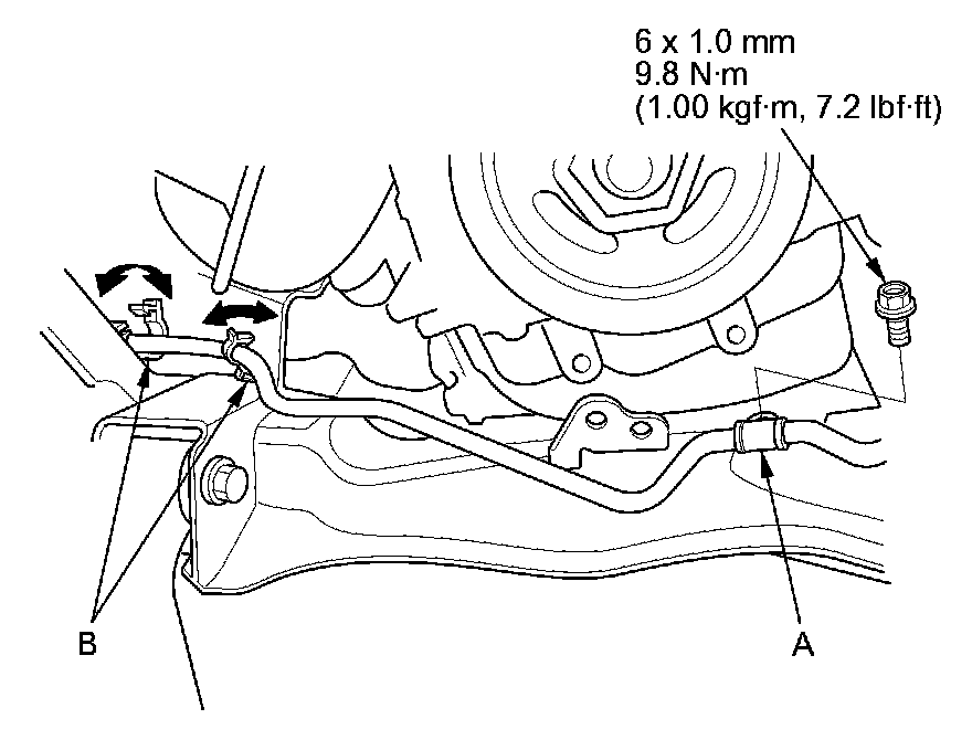 25. Install the power steering fluid line bracket (A), and secure the hose with the hose clamps (B).