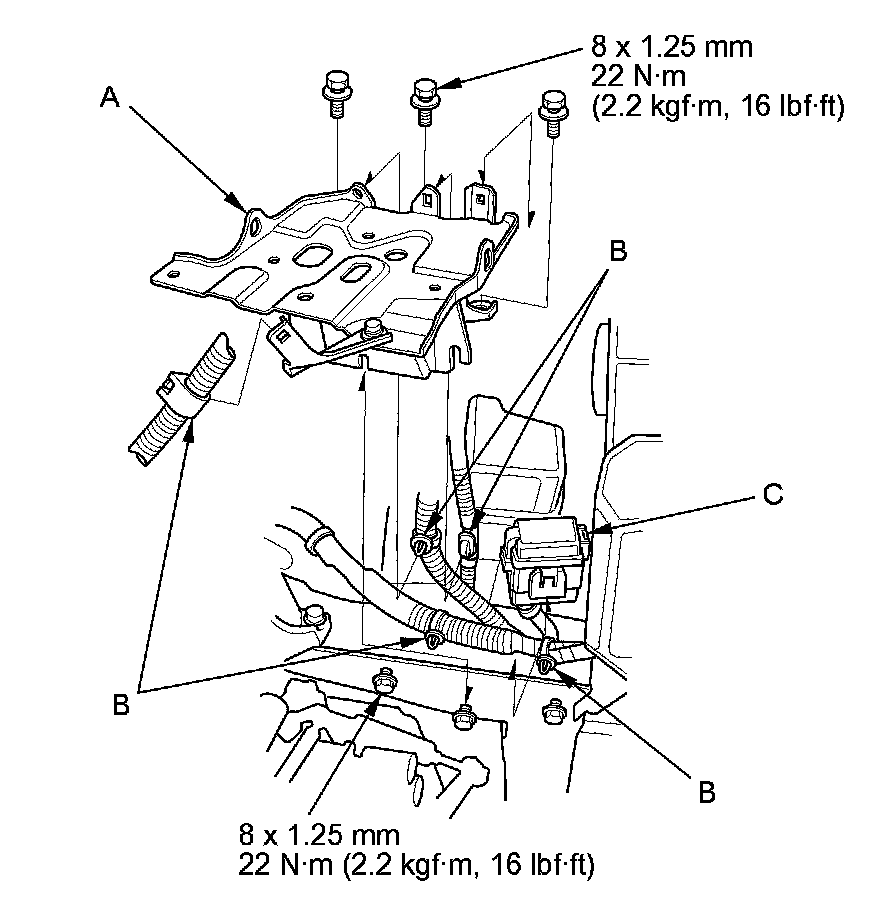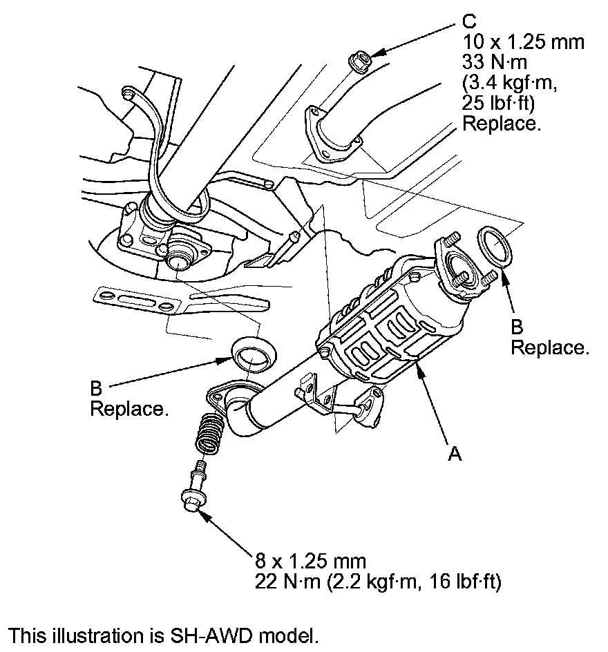 11. Loosely install the new transmission mount mounting bolt and nuts (C), then tighten to the specified torque.