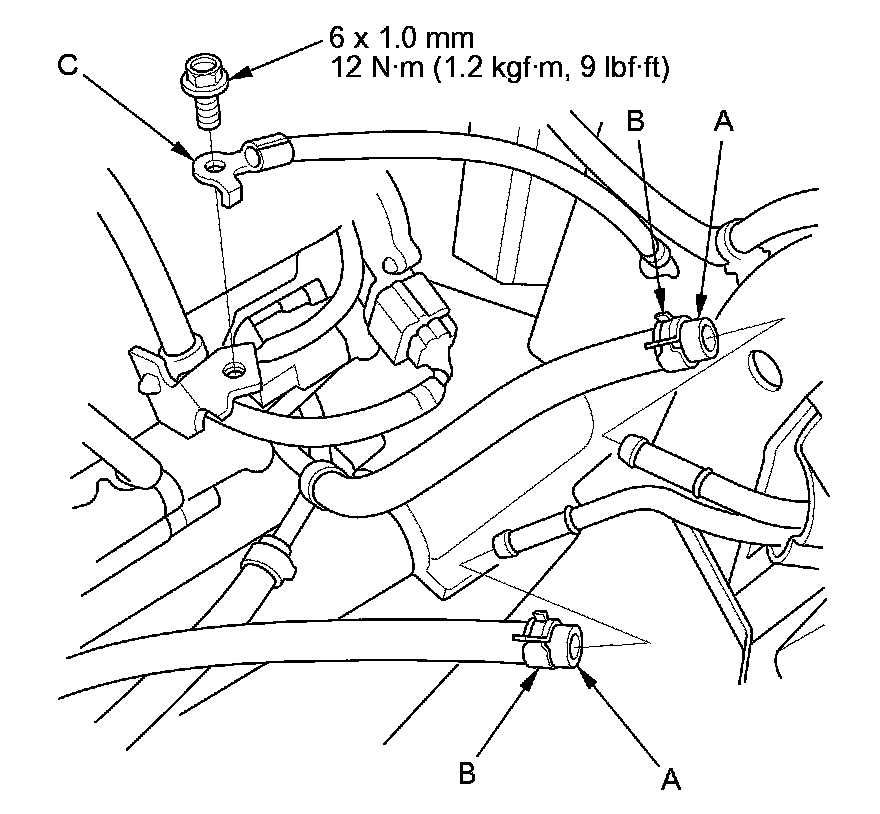 42. Connect the EVAP canister hose (A), the brake booster vacuum hose (B), and the vacuum hose (C).