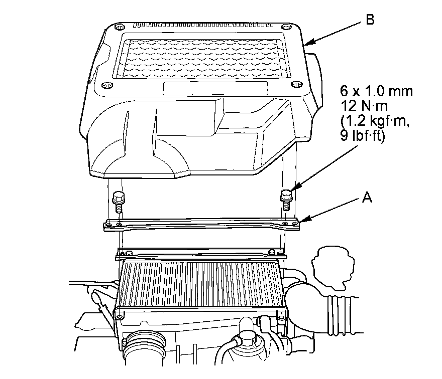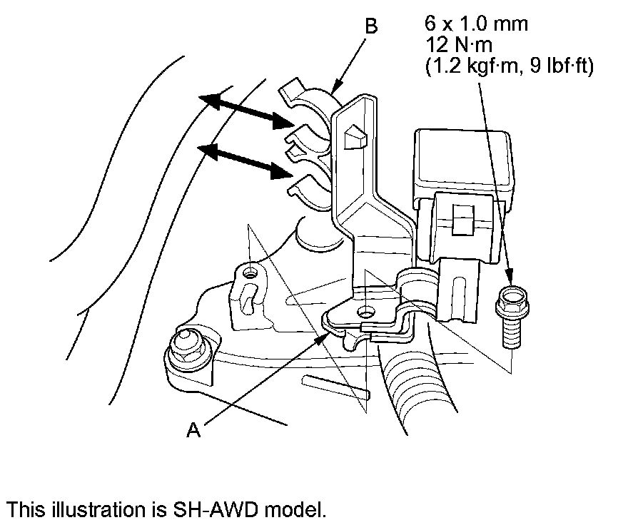 10. Install the transmission mount, then tighten the transmission mount stiffener mounting bolts (A) and the new transmission mount mounting bolts (B).