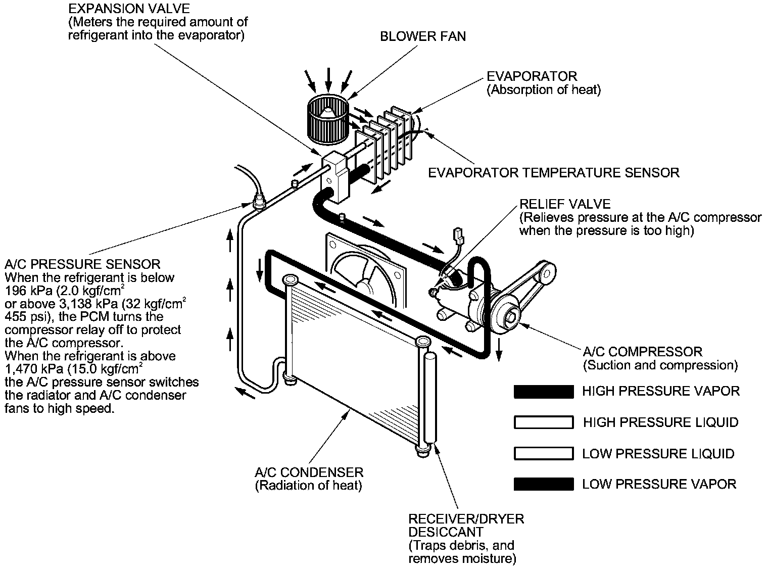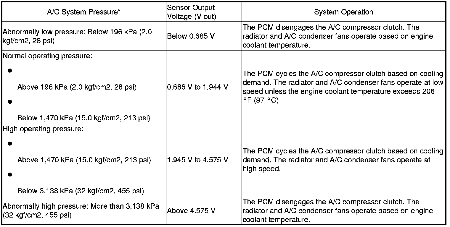 NOTE: When the refrigerant is below 196 kPa (2.0 kgf/cm2, 28 psi) or above 3,138 kPa (32 kgf/cm2, 455 psi), the PCM turns the compressor relay off to protect the A/C compressor. When the refrigerant pressure is above 1,470 kPa (15.0 kgf/cm2, 213 psi), the PCM switches the radiator and A/C condenser fans to high speed.