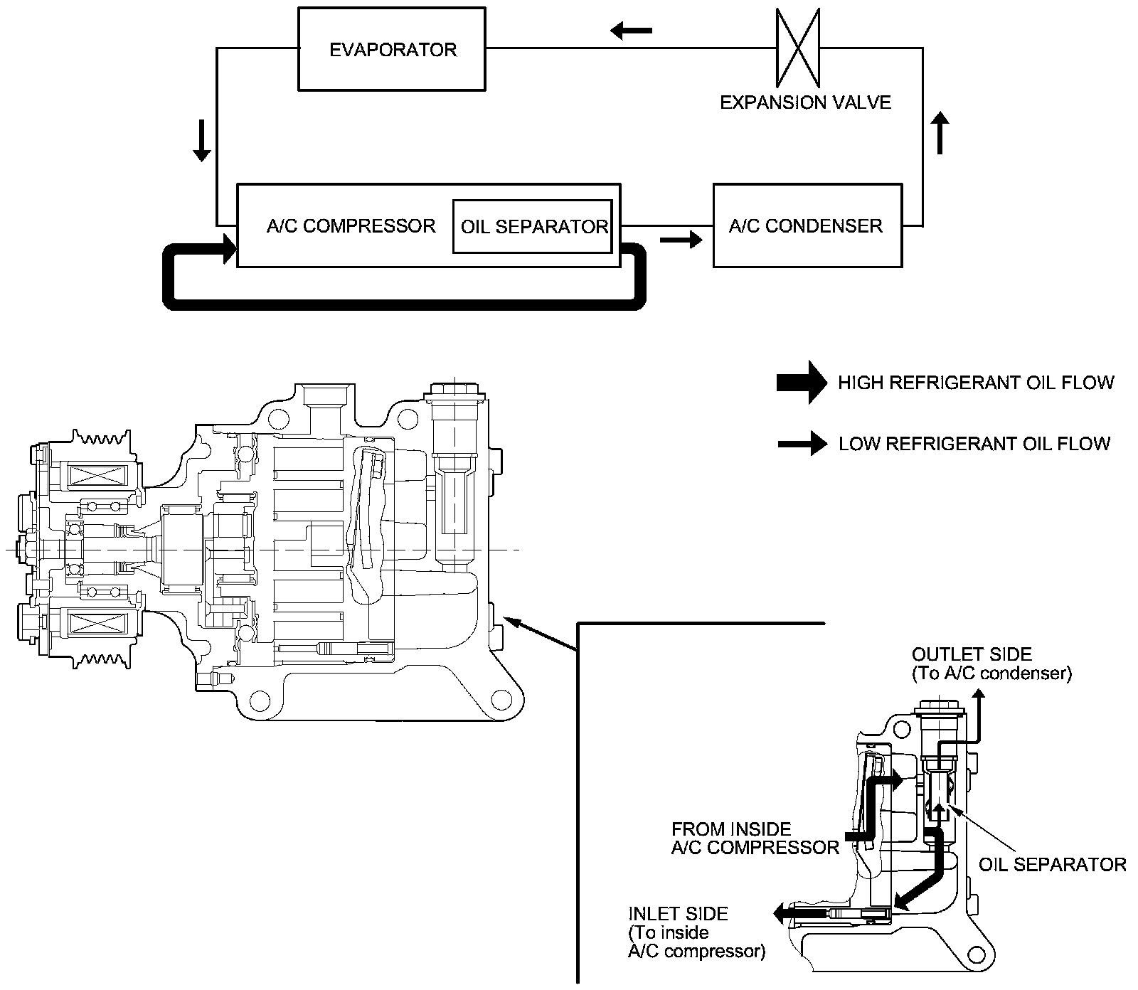 Oil emission from the A/C compressor to the A/C line is reduced by placing the oil separator in the A/C compressor. This results in a thinner oil film inside of the heat exchanger (A/C condenser and evaporator). Air conditioning efficiency is increased without sacrificing engine performance.
