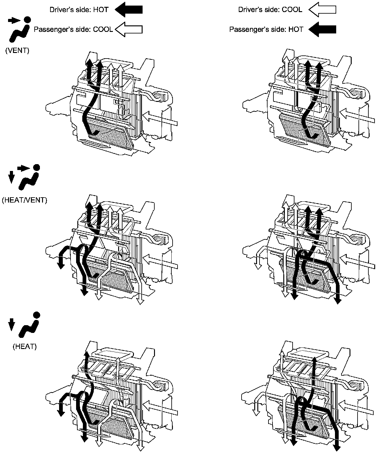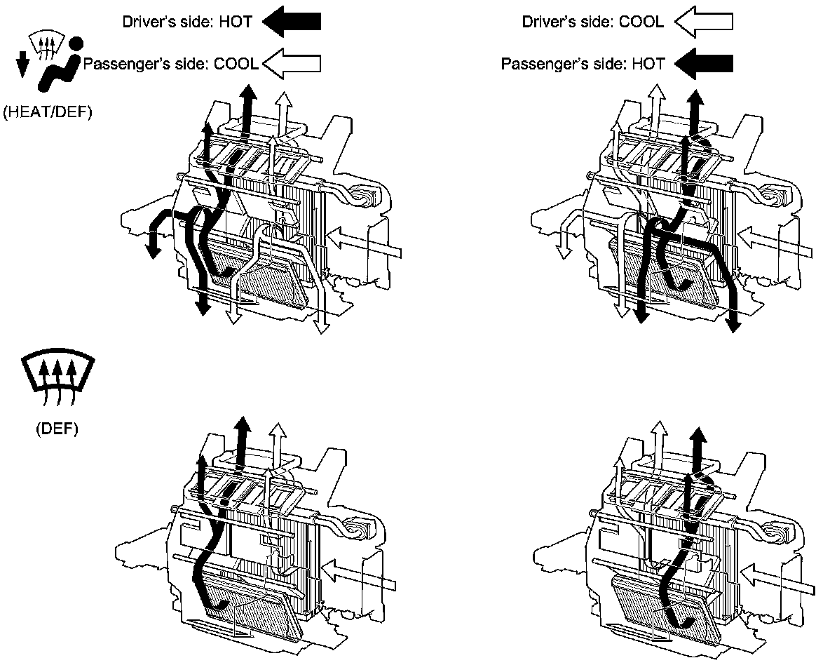 This system automatically controls the temperature and the vent mode of the air direction to the driver and passenger's side, depending on the angle of the sun and the direction of the vehicle. It calculates information such as date, time, longitude, and latitude from the navigation system, as well as the radiant strength of the sun from the sunlight sensor, to determine the appropriate mode position and temperature to be directed to each side.
