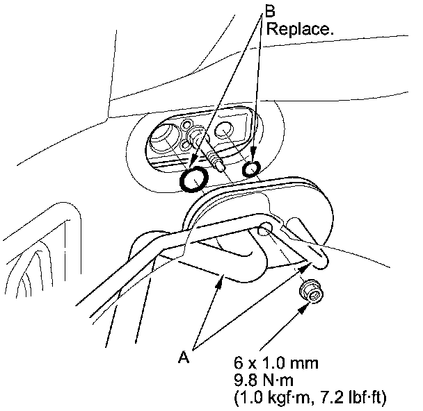 3. Remove the nut, then disconnect the A/C lines (A) and remove the O-rings (B) from the evaporator core.