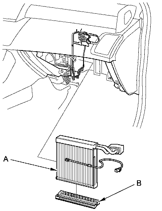 7. Carefully pull out the evaporator core (A) without bending the lines, then remove the plate (B).