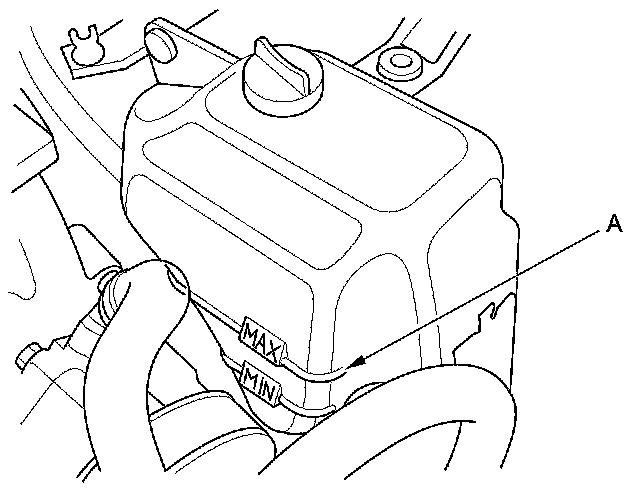5. Fill the coolant reservoir to the MAX mark (A) with Acura Long Life Antifreeze/Coolant Type 2.