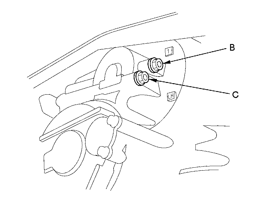 11. Connect the A/T oil pressure gauge to the 1st clutch pressure inspection port (B) and the 1st-hold clutch pressure inspection port (C).