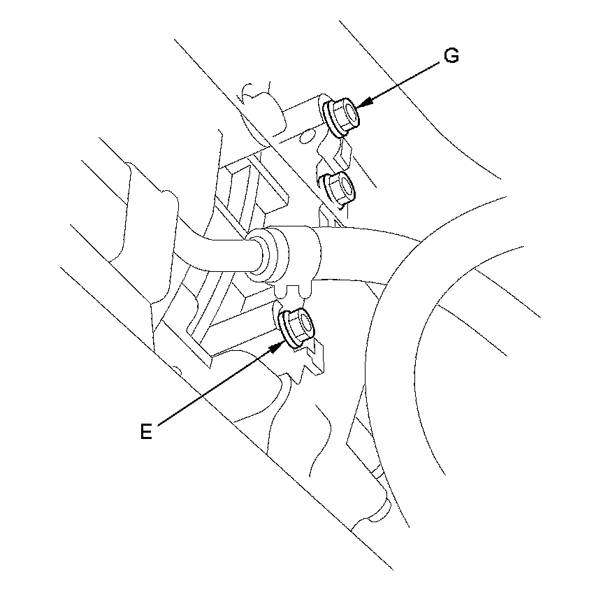 19. Connect the A/T oil pressure gauge to the 3rd clutch pressure inspection port (E) and the 5th clutch pressure inspection port (G).
