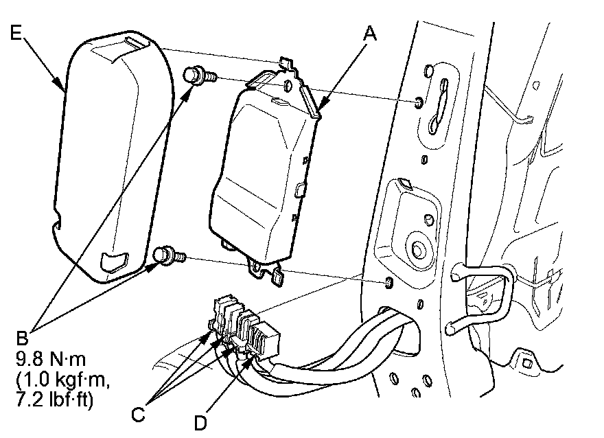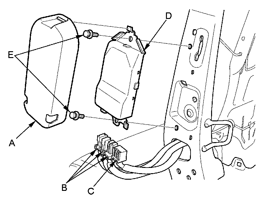 1. Place the ODS unit (A) on the seat-back frame. Tighten the two bolts (B), and connect the OPDS sensor connectors (C) and front passenger's seat wire harness 18P connector (D) to the ODS unit. Reinstall the cover (E).