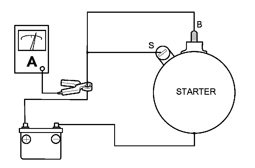 4. Connect the battery as shown, and check for continuity between the B terminal and the starter body. If there is continuity, it is working properly.