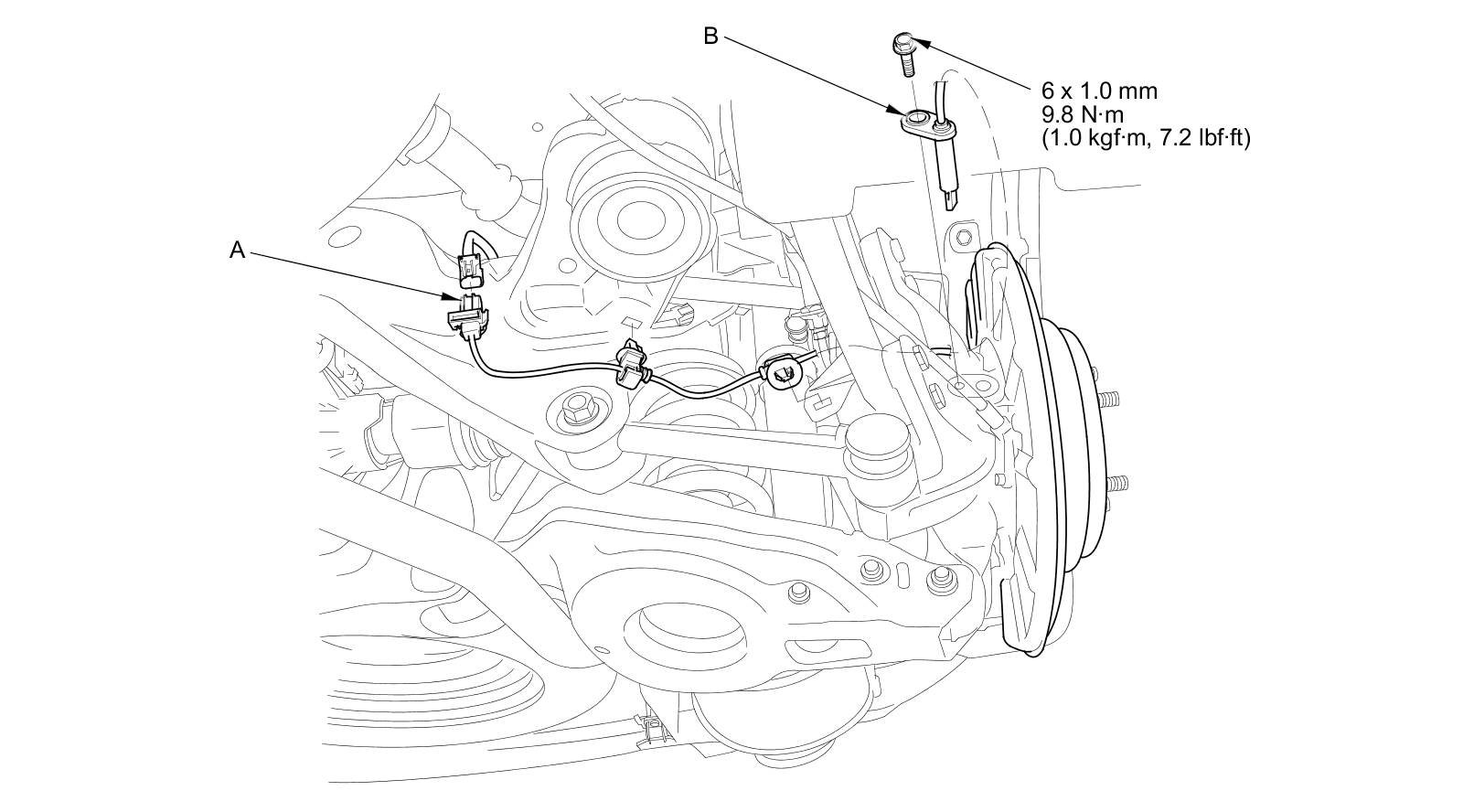3. Remove the clips, the bolt, and the wheel speed sensor (B).