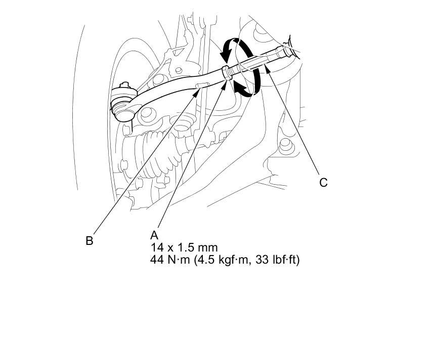 3. Loosen the tie-rod locknuts (A) while holding the flat surface sections (B) of the tie-rod end with a wrench, and turn both tie-rods (C) until the front toe is within specifications.