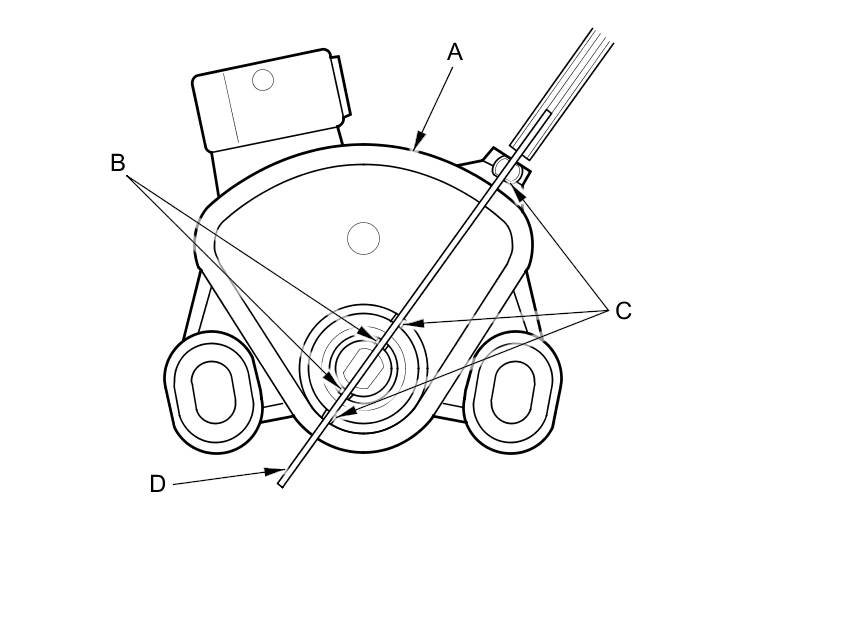 6. Remove the spring clip (A) and the control pin (B), then separate the shift cable end (C) from the control lever (D).