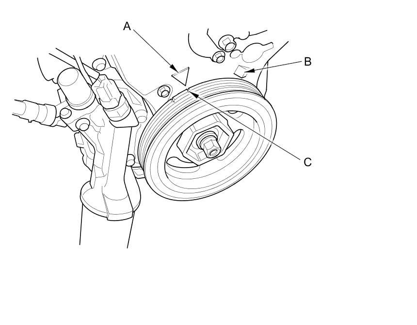 9. Aim the light toward the pointer (A) on the timing belt lower cover. Check the ignition timing under a no load condition (headlights, blower fan, rear window defogger, and air conditioner are turned off).