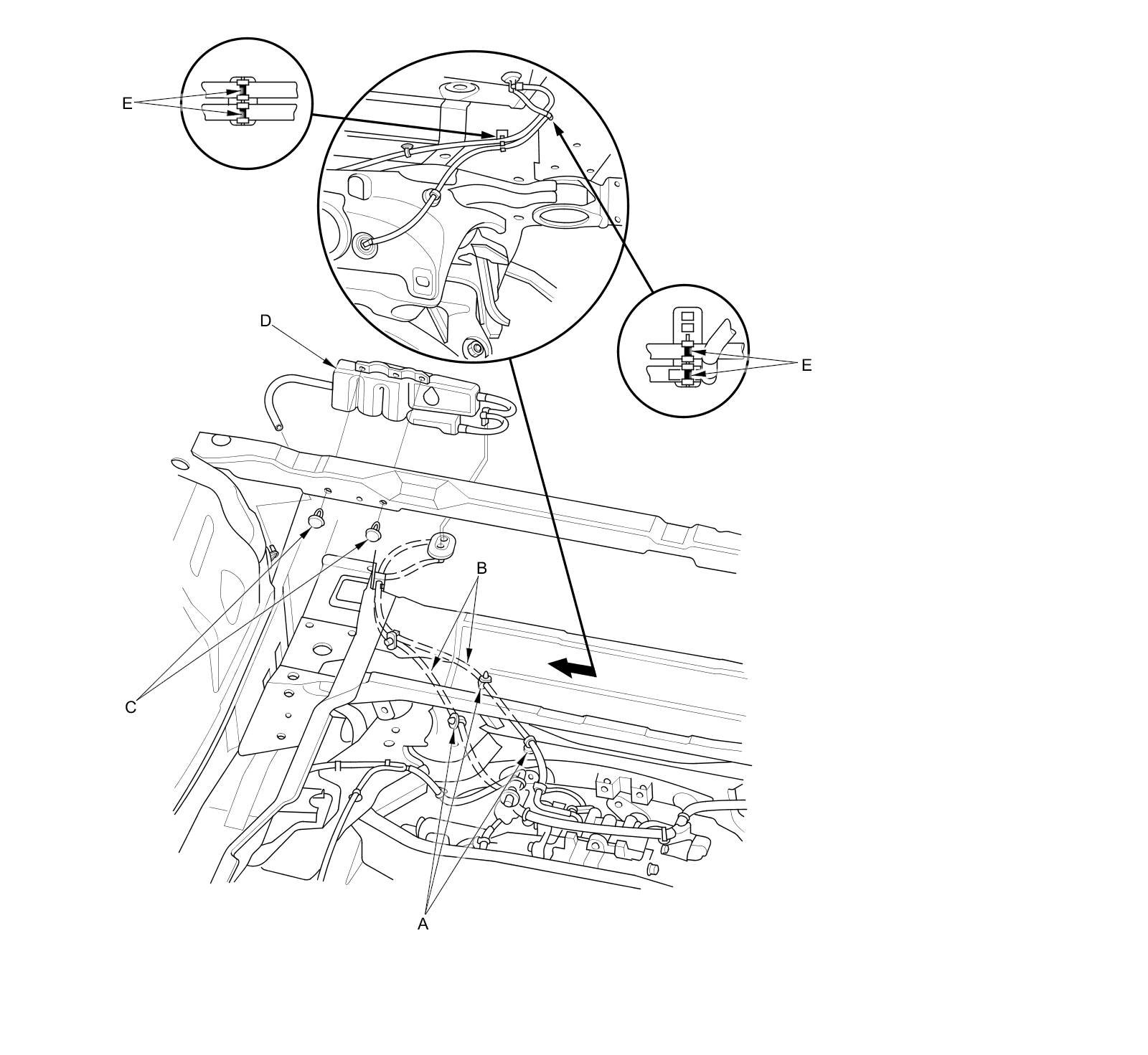 5. Align the point marks (E) on the breather hoses as shown.