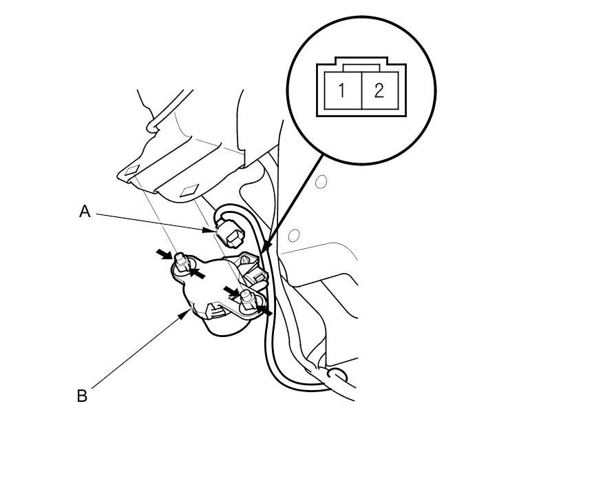 2. Disconnect the 2P connector (A), and remove the keyless buzzer (B) by releasing the hooks.